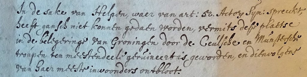heeft gansch niet konnen gedaen worden, vermits dese plaetse in de belegeringe van Groningen door de Ceulsche en Munstersche troupen ten meestendeele geruïneert is geworden, en diensvolgens van haer meeste inwoonders ontbloot, .