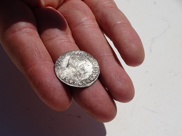 Er zijn wel wat munten gevonden, maar niet veel. Kwart-Philipsdaalder (of was het een dito -gulden?) uit 1571, toen het nog ten jaar zou duren voordat we met een ‘Plakkaat van Verlathinge’ deze koning van Hispandje zouden afdanken:
