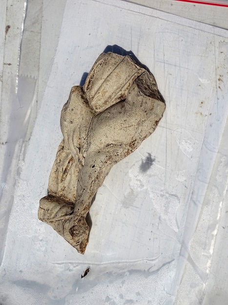 Fragment van een hol pijpaarden Anna-te-Drieënbeeldje, laat-middeleeuws exportproduct van waarschijnlijk Keulen, en als devotionalium in persoonlijk gebruik bij een non: