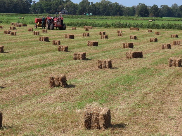 Boer met oude tractor en dito Holland-hooipers voltooide net zijn veld met ouderwetse hooiblokjes: