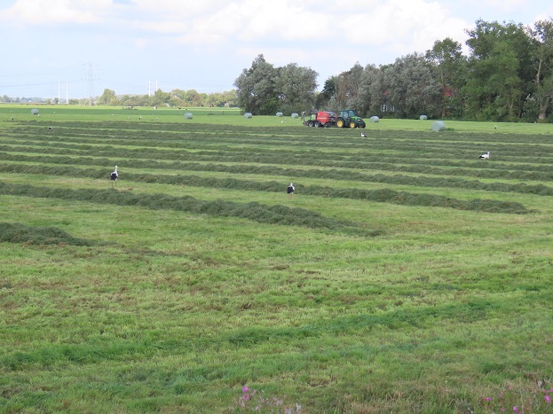 Er staan veertien ooieveaars op deze foto van hooiland aan de noordkant van het Hoendiep bij Oostwolmerdraai: