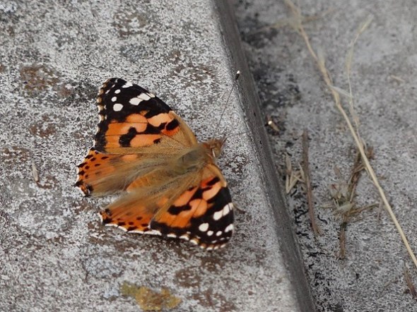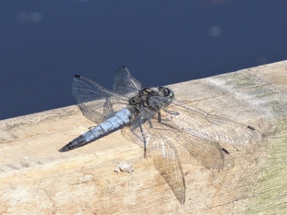 Maar de libellen snorren er nog steeds vrolijk rond, en nemen ook nog af en toe rust op het hout dat er is blijven staan, althans deze oeverlibel doet dat: