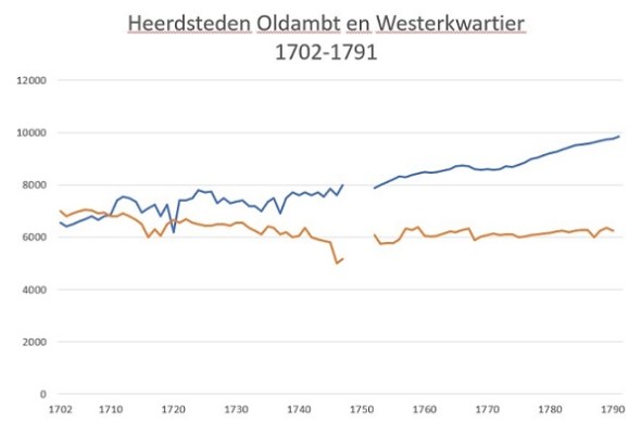 Wat we zien is een uiteenlopen van het Oldambt (blauw) en het Westerkwartier (bruin) – er ontstaat een kloof tussen de opbrengsten van het heerdstedengeld uit beide regio’s. Aanvankelijk zitten die nog dicht bij elkaar. Duidelijk is dat het Westerkwartier meer last heeft gehad van de eerste grote veepestepidemie in 1714 en volgende jaren; waarschijnlijk komt de dip door kwijtscheldingen. Het dieptepuntje van het Oldambt in 1720 kan ik nog niet verklaren; mogelijk heeft die wat te maken met vrijstellingen vanwege de Kerstvloed, drie jaar eerder. Ook de tweede veepestepidemie hakte er eind jaren 1740 in het Westerkwartier veel meer in dan in het Oldambt.