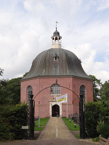 Voor de opgang naar het kerkhof staat nog een poort. Het kerkhof zelf is omgeven door een dubbele gracht. Maar wat het meest opvalt, is de bekroning van het kerkdak. Het lijkt wel of er een siepel of bus op een smalle voet midden op dat dak staat. Tegenwoordig is dat een torentje of dakruiter die rechtstandig en zonder enigerlei poespas de lucht insteekt – zie deze foto, gemaakt op Monumentendag 2018: