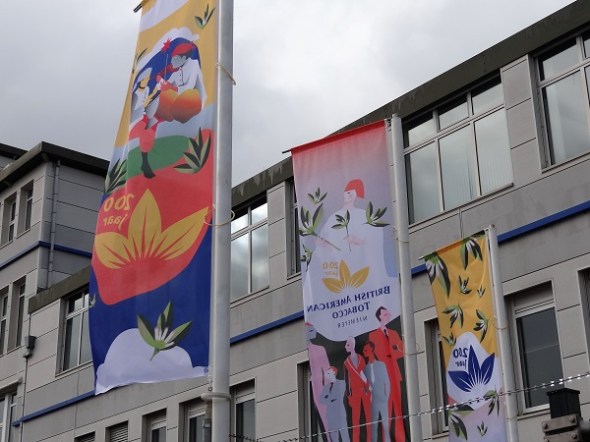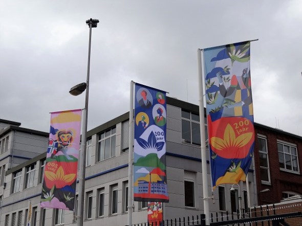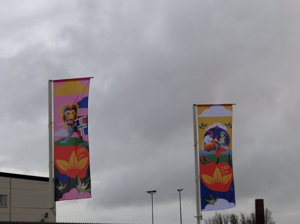 Vaandels ter ere van Niemeijers verjaardag halverwege de Peizerweg, waar de tabaksfabriek een grote opslag heeft: