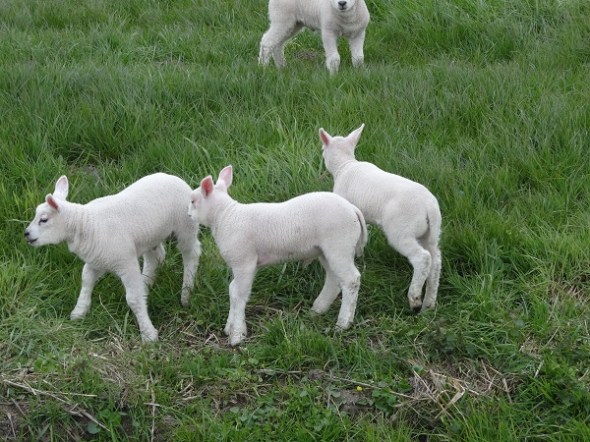 Faan – drie lammeren. Ze stonden mooi naast elkaar, maar toen ik de camera pakte zochten ze haastig hun moeder op: