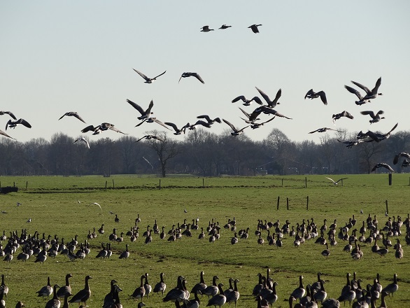 Geplaatst op: 15 februari 2019 Hoort bij: Westerkwartier 10 reactiesGanzen op de Leutingerwolder es. Terwijl ik deze een half metertje vanaf mijn fiets stond te fotograferen, kwam me zo’n vlucht achterop die me de volle laag gaf: groene klodders met half verteerd gras in mijn haar, boven mijn wenkbrauw, op mijn camera, mijn fietsbel en mijn zadel. Misschien is het beter te spreken van een tapijtbombardement. Helaas er niet aan gedacht om een selfie te maken. Prees me gelukkig dat ik genoeg zakdoekjes bij me had: