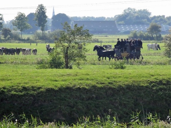 Bij café Hammingh in Garnwerd stapte een gezelschap dames en heren op en in koetsen. Later zag ik dit Pickwick-achtige tafereel in de verte bij Oostum: