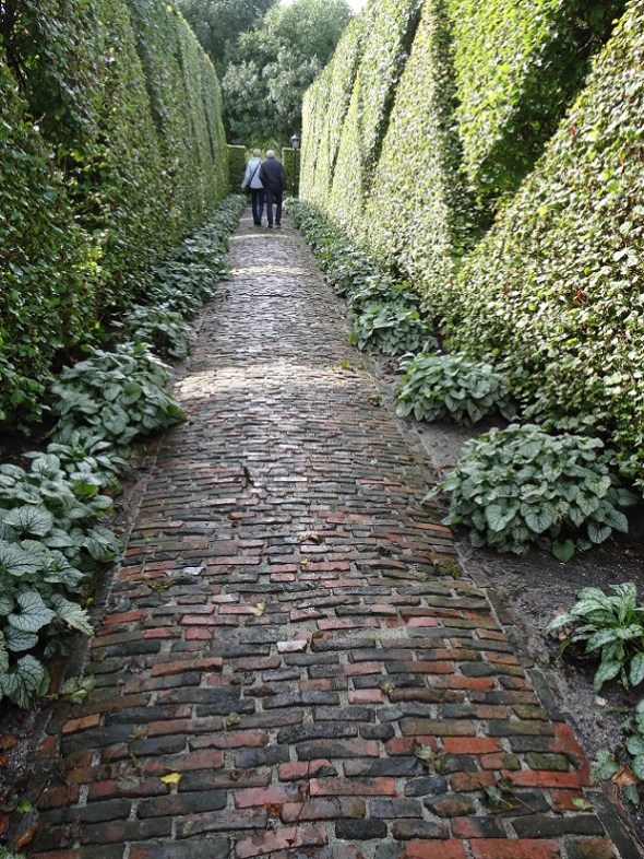 Er leidt een klinkerpaadje heen, omzoomd door enorme geschoren hagen:
