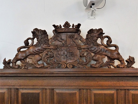 De hervormde kerk van Noordhorn – houtsnijwerk herenbank, mogelijk gesneden door Jan de Vrij, met het wapen Geertsema: