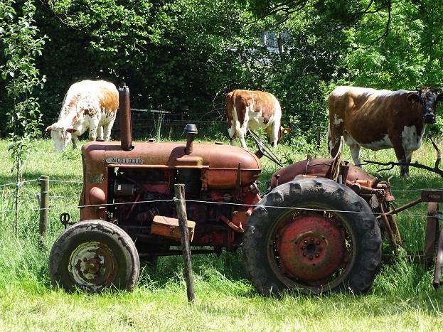 Boerderijtje bij de A7 in de Kleine Oostwolderpolder, met een oud trekkertje ervoor: