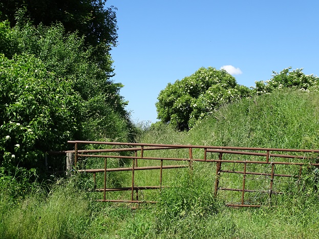 Mij was verteld dat je er zo heen kon gaan, maar helaas, er stond inmiddels een hek dwars over de weg, dat was vastgemaakt met een koetouw. Een vrouw uit het huis ernaast maakte zich bekend als eigenares en ontzegde mij de toegang. Ik moest maar naar de makelaar als ik belangstelling had: