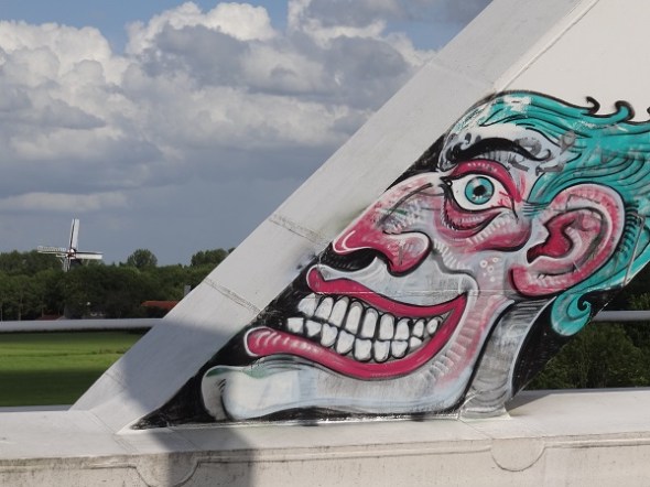 Graffiti op de Walfridusbrug – de molen in de verte, de Wilhelmina van Noorderhogebrug, heeft geen optimale molenbiotoop: