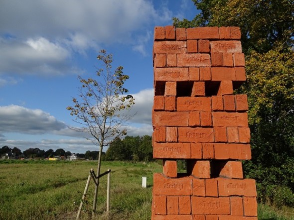Aan de andere kant van de weg bij een nieuwbouwproject een stapel rode bakstenen met aTerheijl erin gebakken::