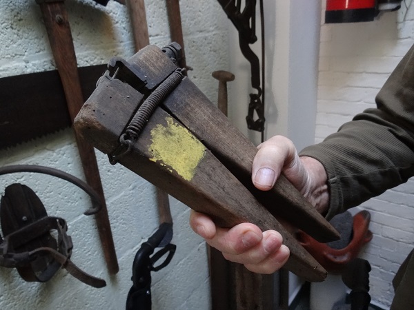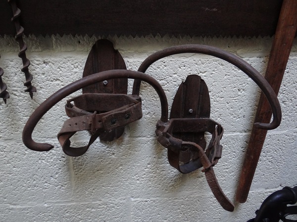 Doel van de reis: elektriciënsgereedschap, waarschijnlijk nog gebruikt door mijn grootvader. Zoals deze klimschaatsen waarmee je, gecombineerd met een riem om je middel, vrij gemakkelijk een A-paal kon beklimmen voor reparaties aan het destijds nog bovengrondse net: