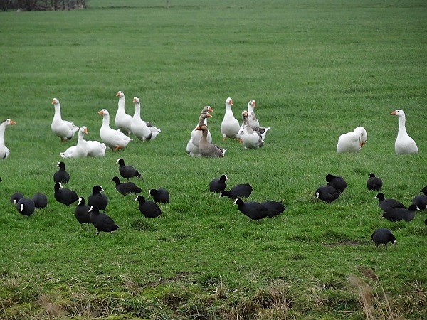 – Bij het Aduarderdiep – gans en meerkoet mengen zich niet: