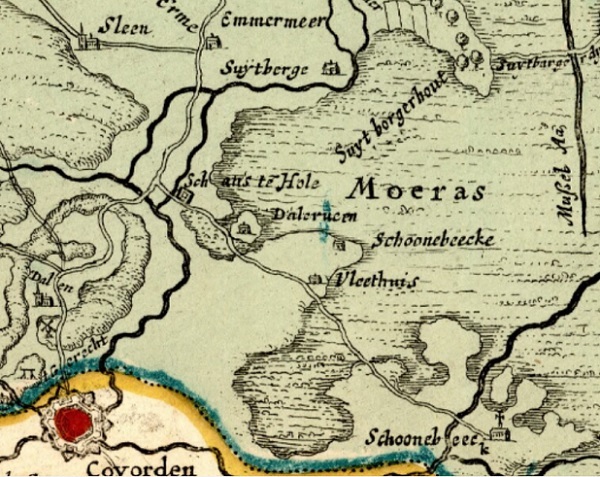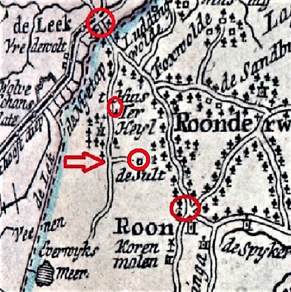 Inderdaad staat die route op één enkele kaart, zij het van Groningerland (zie pijltje op kaartuitsnede boven): het betreft een zijweg vanaf de Scheperij over de heide naar De Zulthe. Destijds nog actuelere kaarten van Drenthe laten dit wormvormig aanhangseltje echter helemaal niet zien; sterker nog, ze tonen vaak niet eens de Heijlsterweg van Ter Heijl naar Nietap. Volkomen begrijpelijk dus, dat de kerspellieden van Roden dit argument resoluut van de hand wezen. In hun historische visie was er nooit een ree- of kerkweg naar Roden geweest. Op de middeleeuwse uithof van de abdij Aduard in Ter Heijl stond een kapel, waar volgens hen de lokale doden werden begraven. Een ree- en kerkweg naar Roden was dus niet nodig geweest en ook niet in het Zultherveld te vinden. Van een markescheiding was zo’n weg ook niet bekend, en sinds mensenheugenis was er evenmin zo’n weg geschouwd.