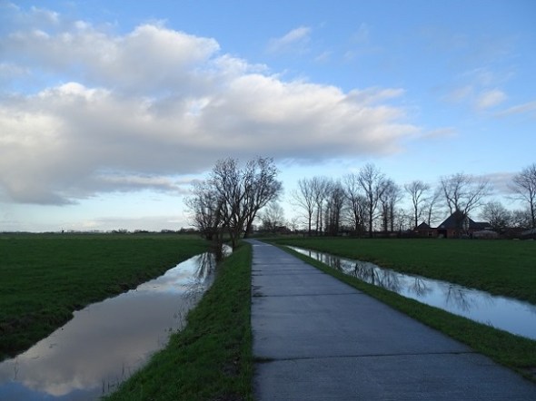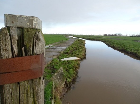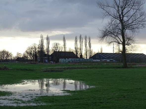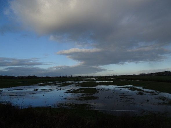 Ondergelopen land bij het Kliefdiep, Hoogkerk. Als hoog, door storm nog eens opgestuwd buitenwater het spuien belemmert, komt er allicht nog veel meer water op het land te staan: