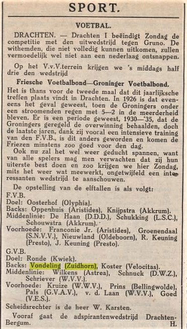 Ontdek via de Drachtster Courant op Delpher, dat een jongere broer van mijn grootvader vlak voor de oorlog als back in het Groninger Elftal speelde. Waarschijnlijk was het Hein, omdat Klaas Vondeling al naar Assen was verhuisd, waar hij in Achilles speelde. In het Groninger team zat slechts één GVAV-er; WVV Winschoten (later de club van Klaas Nuninga, Jan Mulder en Arie haan) was de hofleverancier van het team met drie spelers, waarvan er twee in de voorhoede speelden.