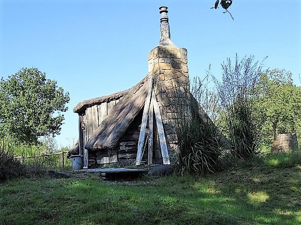 Plaggenhut met terrazzo-achtige schoorsteen op camping De Blauwe Haan bij Uffelte: