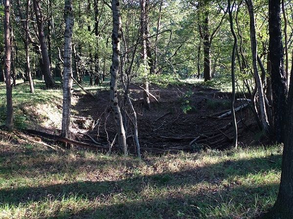 Bomkrater, waarschijnlijk daterend van 24 maart 1945, toen een geallieerde luchtvloot hier een tapijtbombardement losliet op het Duitse vliegveld. Mijn grootvader was die dag jarig – alle gasten stonden buiten te kijken naar de passerende bommenwerpers: