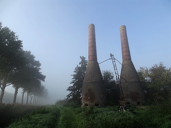 De kalkovens voorbij Dieverbrug, met hun schoorstenen in de zon::