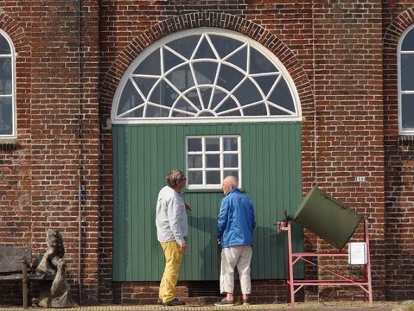 Roeiers van middelbare leeftijd wachtend voor de Dorkwerdersluis: