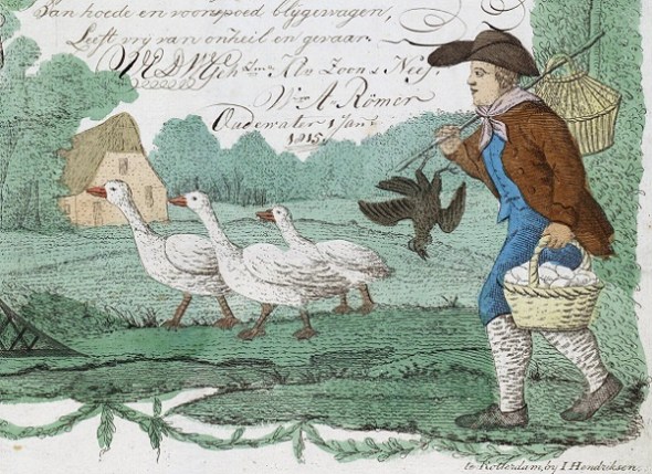 Leonardus Schweickhardt, Wensbrief met een boer en zijn ganzen (uitsnede),1815. Rijksmuseum.