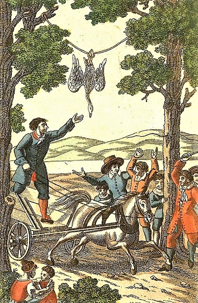 Men houdt hier veel van papegaaischieten, de kat uit de ton te smijten, eene gans het hoofd af te trekken, ’s winters op schaatsen op den ring te rijden, een soort van toernooispel. Ook begint men bij het dobbelen het kaartspelen te voegen, ’t geen voor weinige jaren nog onbekend was. Waarom heeft men tegen het kaatsen, ’t geen openlijk geschiedde, uitgevaren en de jeugd in de kroegen gedreven?”