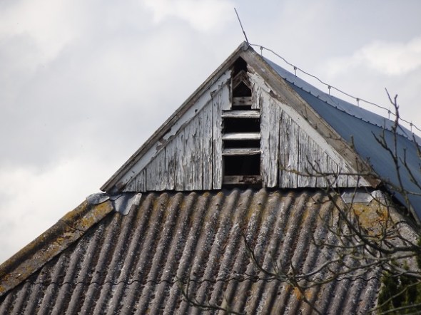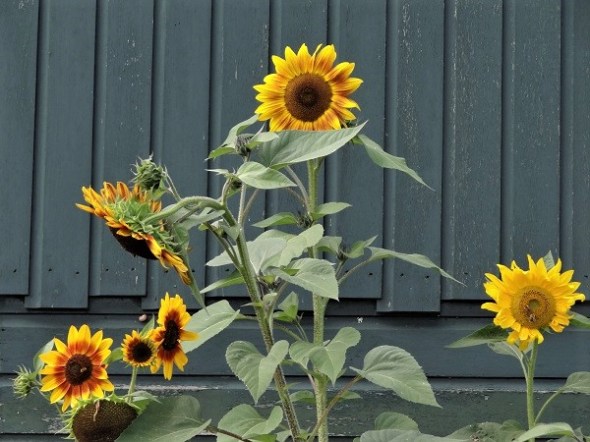 Zonnebloemen tegen schuur, Zijlvesterweg Leegkerk: