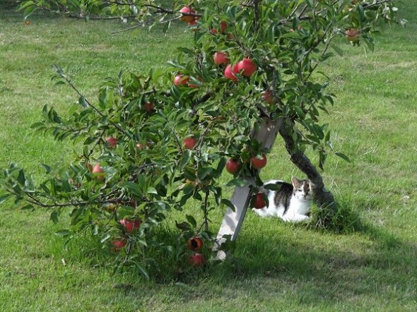 Oldijk tussen Hardeweer en Ezinge – appelboompje buigt door onder de vruchtenlast en wordt gestut – kat ligt op de loer: