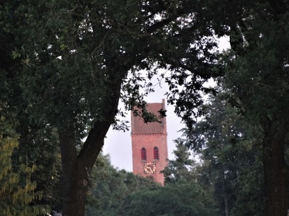 Iets verderop heb je heel even een doorkijkje via de Pasop zuidzijde op de toren van Midwolde:
