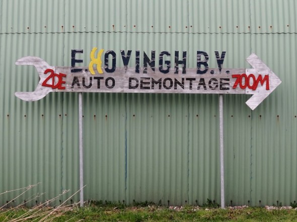 Oud toegangsbord van autosloperij, in verband met tweede vestiging gereviseerd tot richtingaanwijzer, naderhand nog voorzien van niet bijpassende H, Aduarderdiepsterweg: