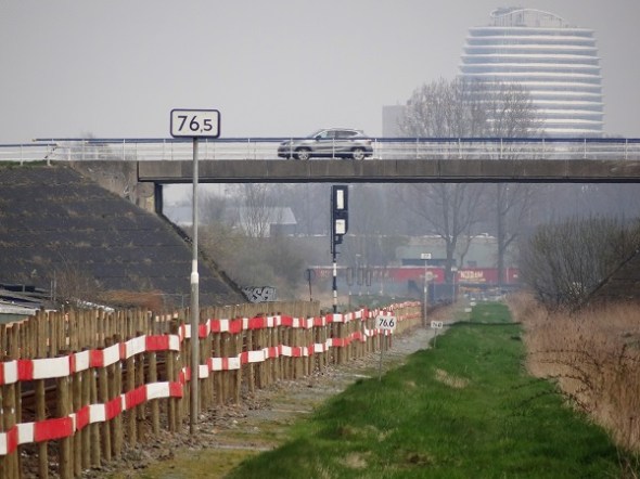 Langs het spoor staan vanaf de Zuiderweg nu opeens allemaal roodwitte hekjes. Dat is in verband met de aanstaande spoorverdubbeling. In de verte zie je het viaduct in de Johan van Zwedenlaan, nog verder weg het DUO-gebouw in de Stad:
