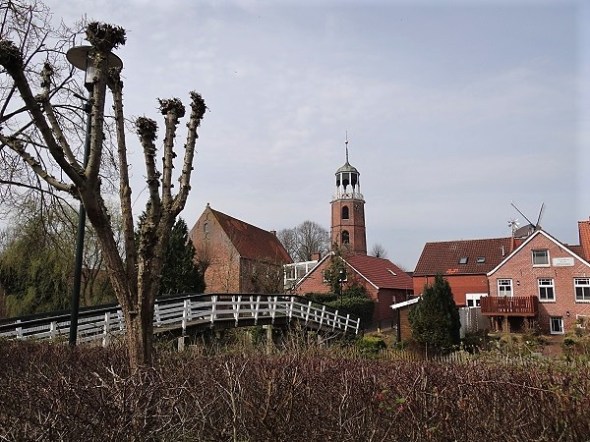 Ditzum, dorpsgezicht met Lutje Brug over het Zijldiep – de kerktoren doet vuurtorenachtig aan: