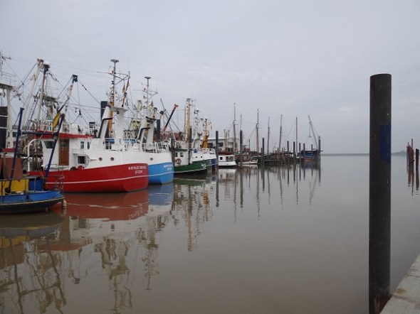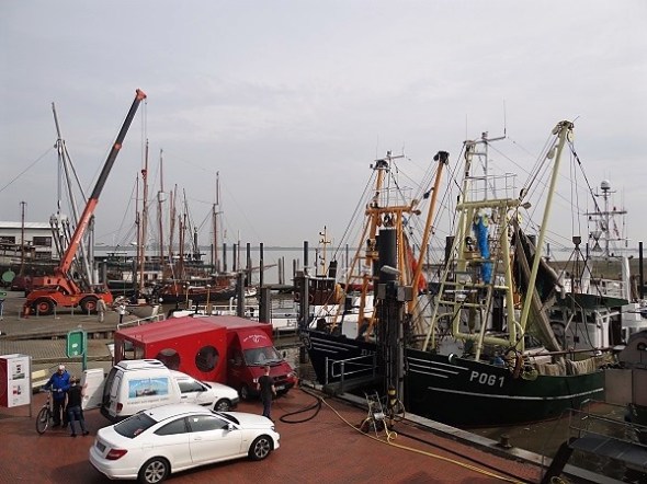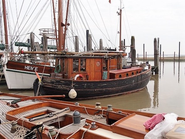 Het haventje van Ditzum – links tilde een kraan net een zeiljacht in het water: