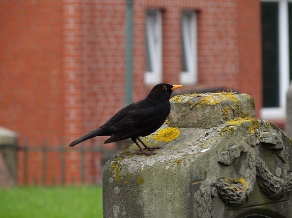 Een merel op het kerkhof aldaar – niet schuw, maar wel oplettend:
